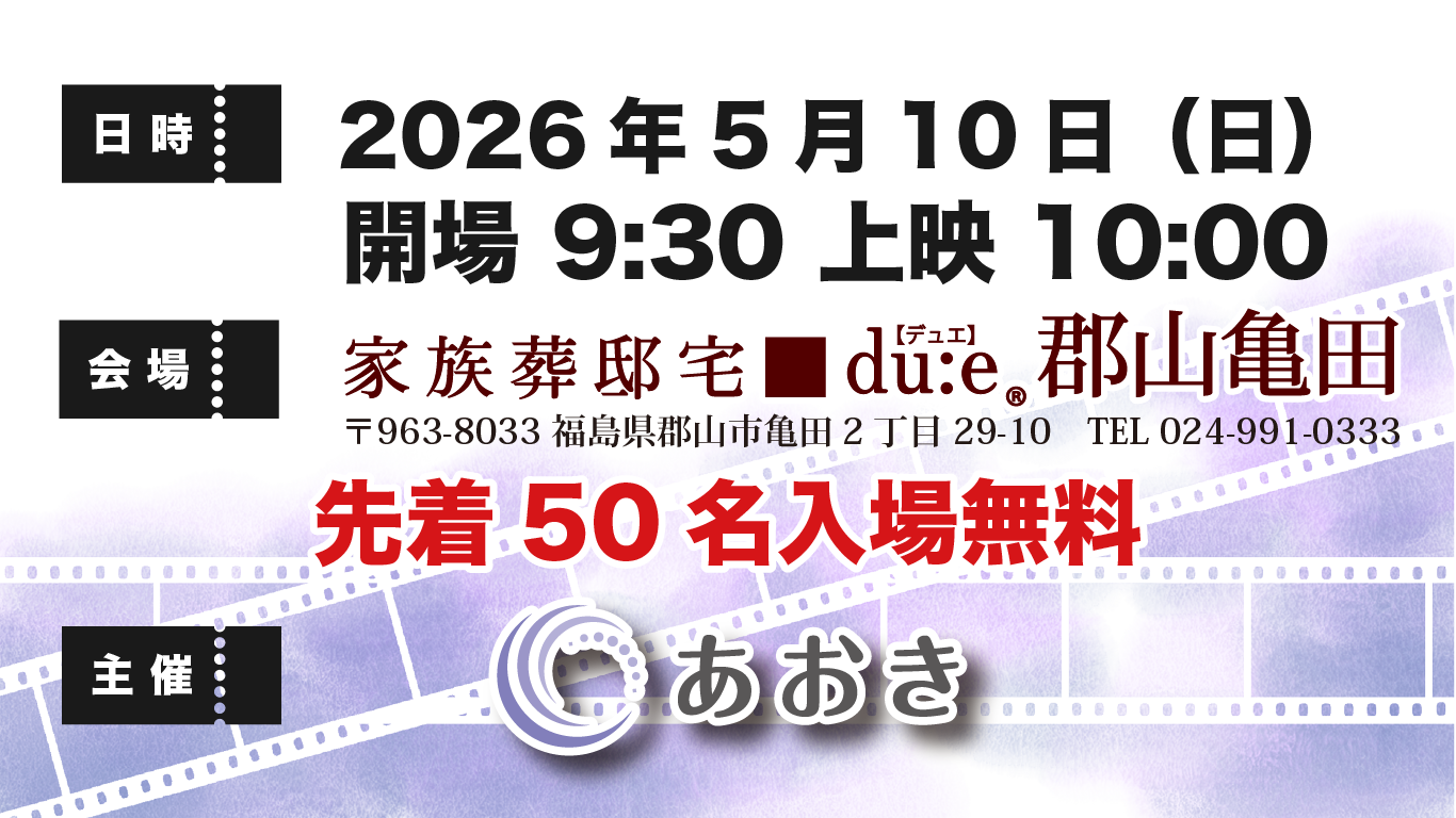 「あおきメモリーシネマ」では、家族葬邸宅デュエのメモリアルムービー上映設備を使用し、名作映画を上映いたします。どなたでもご参加いただけますので、ぜひ心豊かなひとときをお楽しみください。