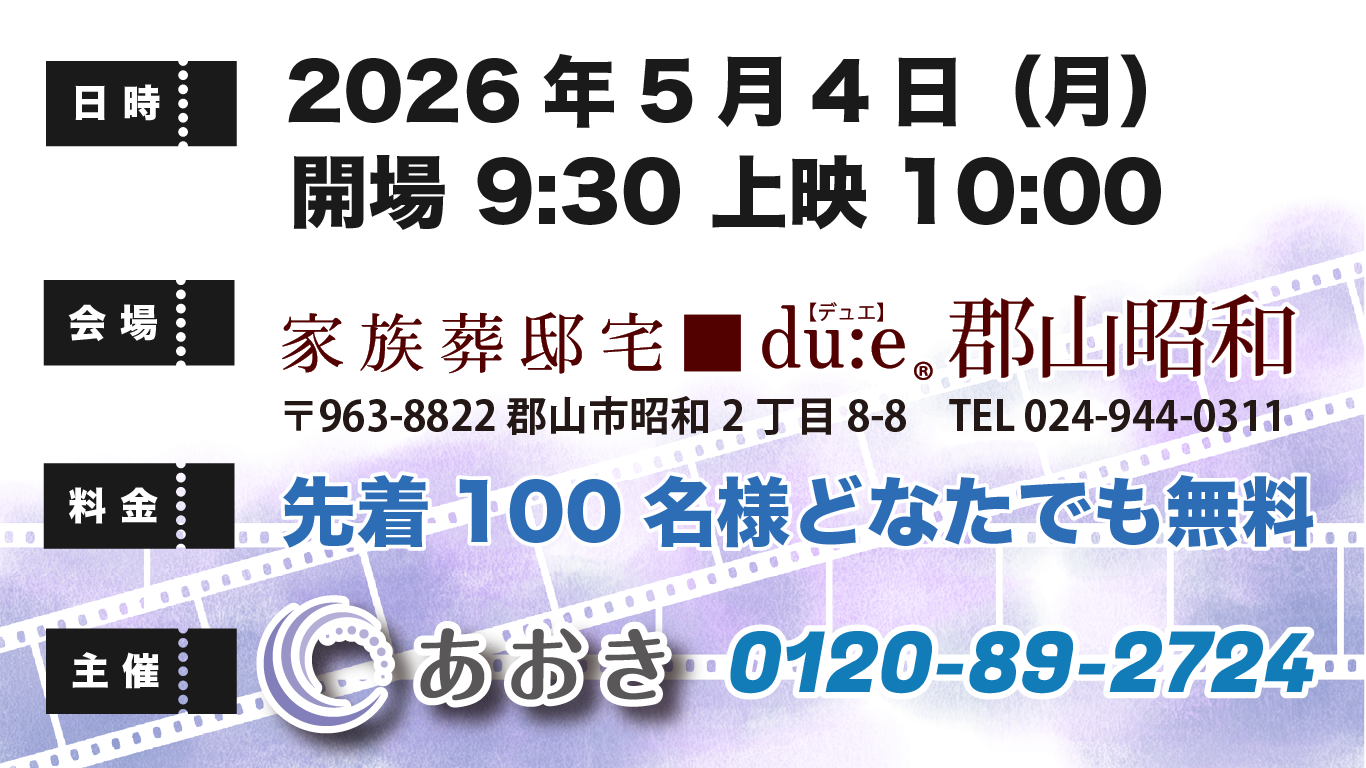 「あおきメモリーシネマ」では、家族葬邸宅デュエ郡山昭和のメモリアルムービー上映設備を使用し、名作映画を上映いたします。どなたでもご参加いただけますので、ぜひ心豊かなひとときをお楽しみください。