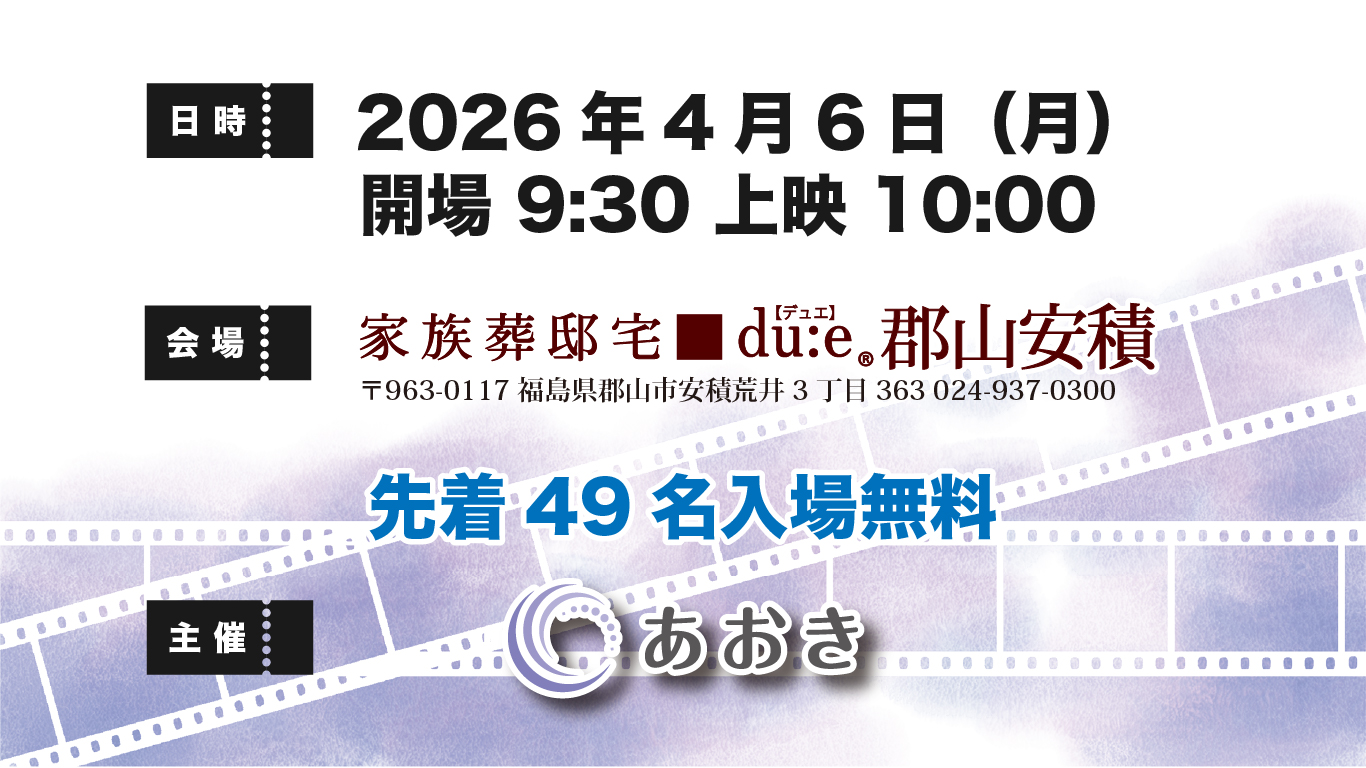 「あおきメモリーシネマ」では、家族葬邸宅デュエのメモリアルムービー上映設備を使用し、名作映画を上映いたします。どなたでもご参加いただけますので、ぜひ心豊かなひとときをお楽しみください。