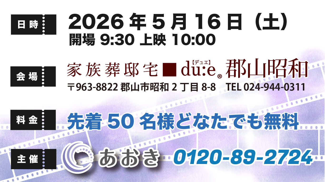 「あおきメモリーシネマ」では、家族葬邸宅デュエ郡山昭和のメモリアルムービー上映設備を使用し、名作映画を上映いたします。どなたでもご参加いただけますので、ぜひ心豊かなひとときをお楽しみください。